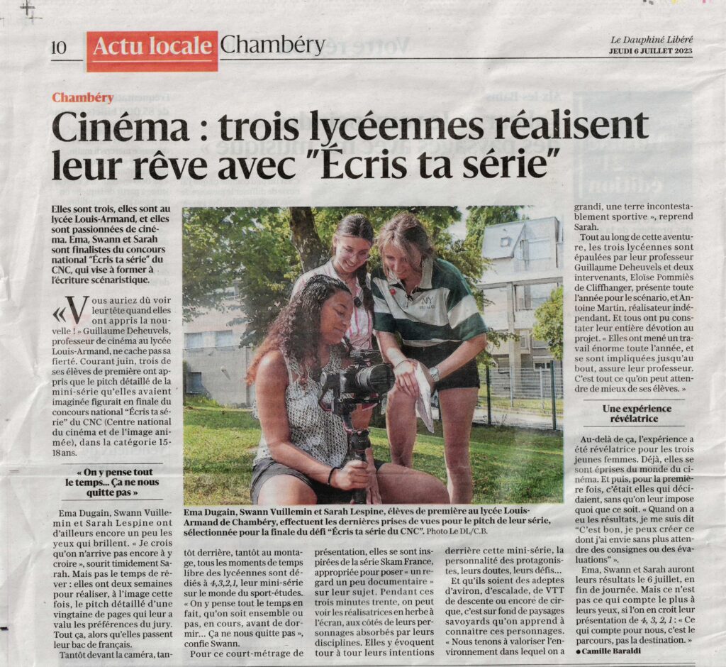 Création par petits groupes d’une mini-série au sein de ma spécialité cinéma, à l’occasion du concours lancé par l’organisme du C.N.C “Écris ta série !”. Moi et mon équipe sommes montée à Paris avec les 12 autres finalistes (sur 280 au départ).